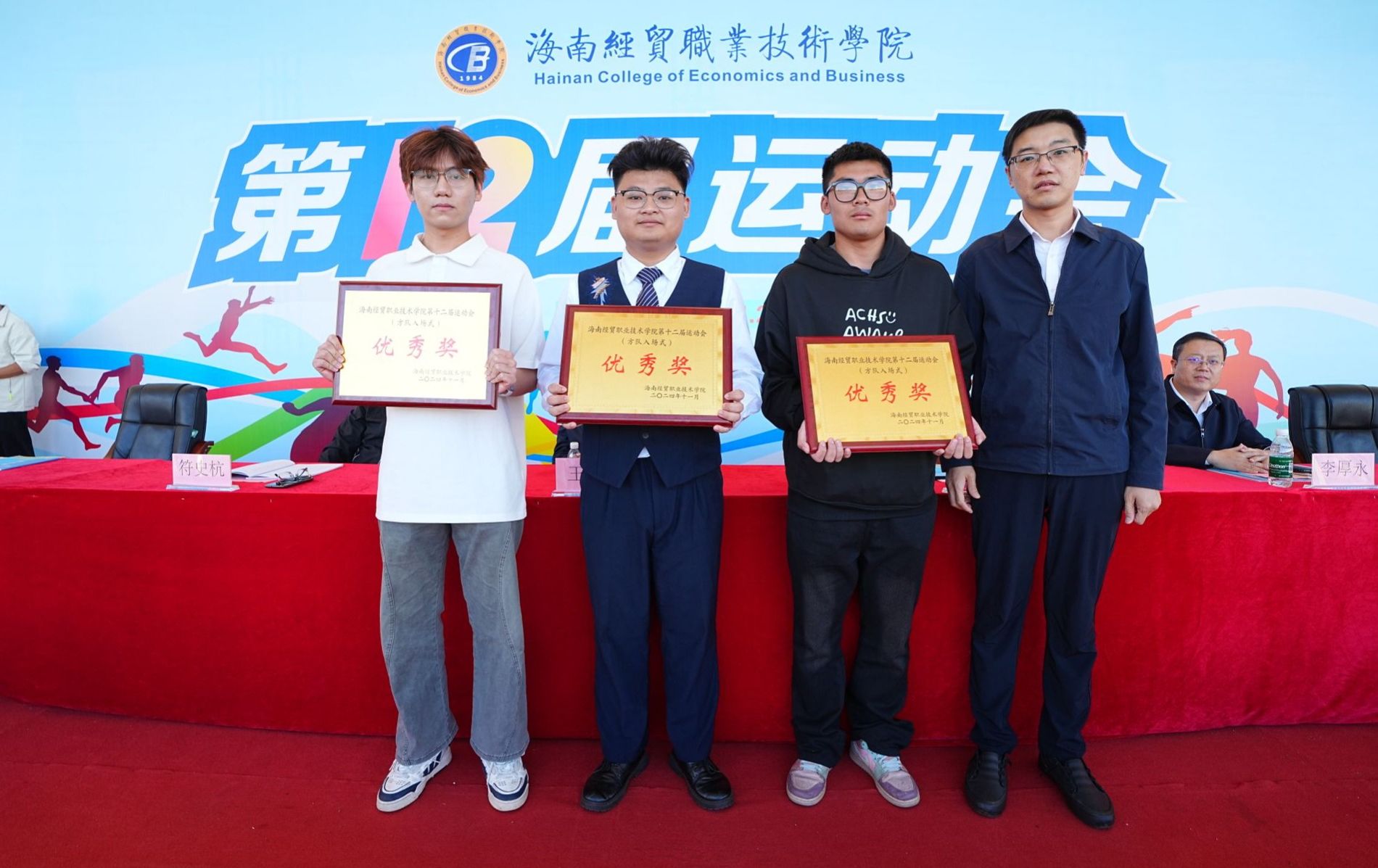 闭幕式上,学校表彰了本届运动会获奖团体和个人。国际贸易学院、机关第二分工会、机电与汽车工程学院、机关第一分工会、国际教育学院、信息技术学院分别获得教职工团体总分第一至第六名;体育与健康学院、国际旅游学院、信息技术学院、财务管理学院荣获学生团体总分第一至第四名;信息技术学院、国际旅游学院、人文艺术学院获得体育道德风尚奖;财务管理学院、信息技术学院、国际旅游学院获得入场式优秀奖;国际旅游学院、国际贸易学院、财务管理学院获得啦啦操表演奖一、二、三等奖;陈磊等28人获得“优秀裁判员”称号;陈明艳等18人获得“优秀运动员”称号。