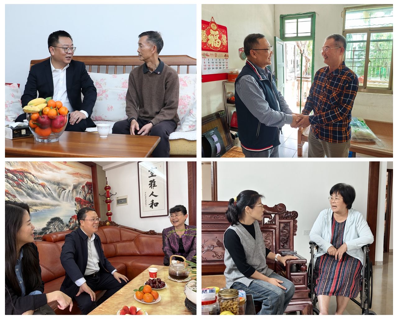 在王正华、徐光炜等退休老同志代表的家中,校领导与老同志们促膝长谈、亲切交流,向他们介绍了学校日新月异的变化和近年来发展建设情况,悉心询问退休同志的身体状况、生活起居和实际需求。校领导深情表示,老同志们是学校发展建设的宝贵财富,是学校教育事业的奠基者和开拓者。海经贸始终铭记老同志们的付出与奉献,将持续做好退休教职工的服务保障工作,用心用情解决急难愁盼问题,让老同志们安享幸福晚年。